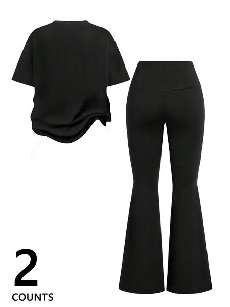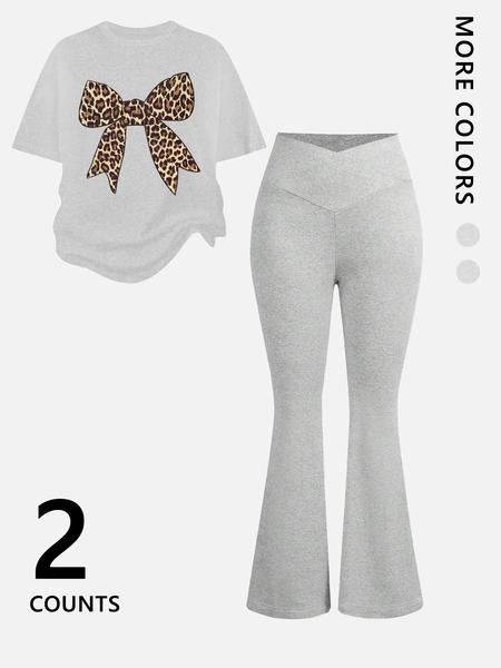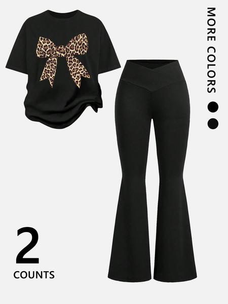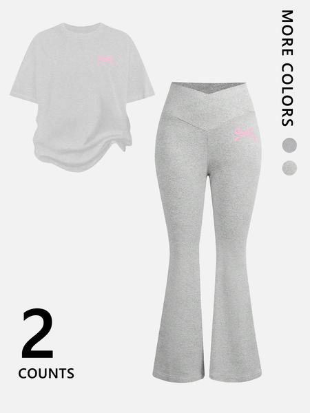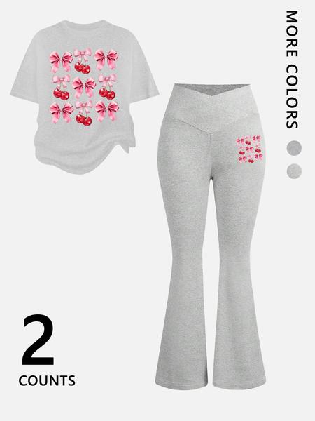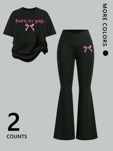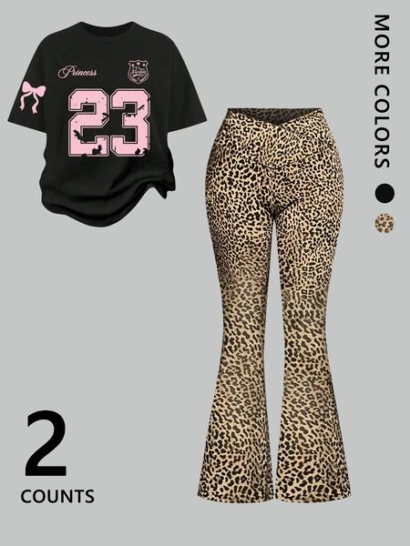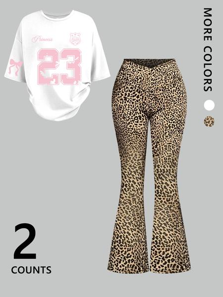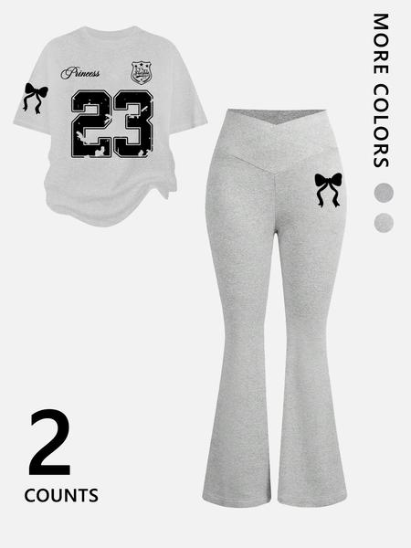 Two-Piece Women'S Suit Featuring Number 23 Bow Print Drop Shoulder T-Shirt and Flared Pants. This Stylish Two-Piece Set Is Perfect for Everyday Wear and Is Trendy for All Seasons, Womenswear