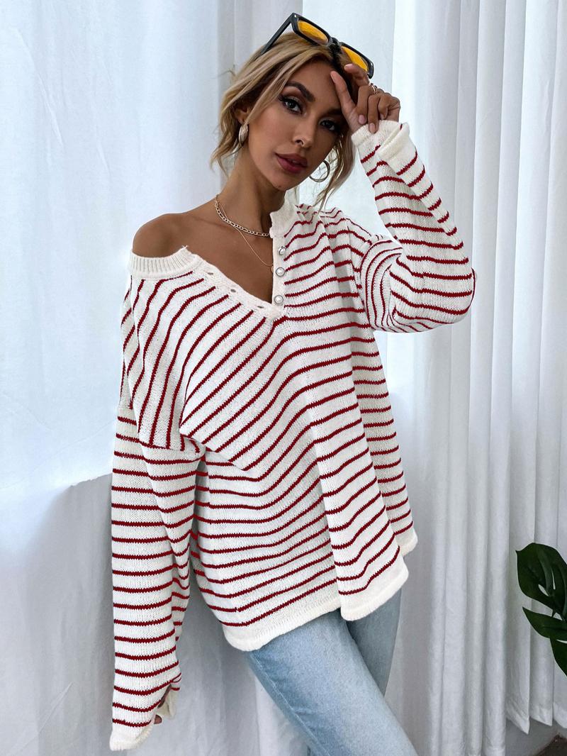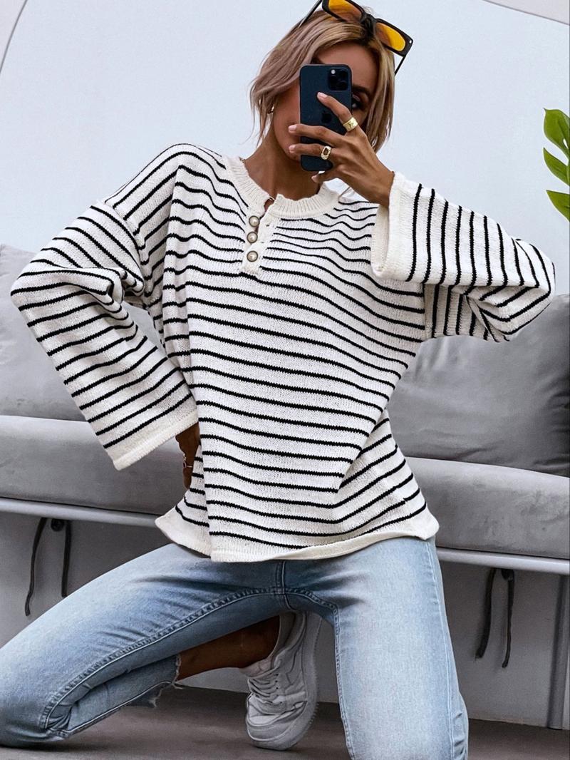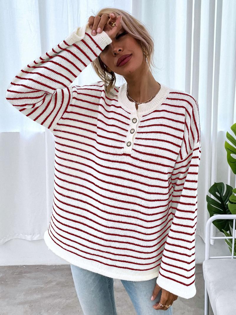 Women'S Colorblock Striped Print Button Front Drop Shoulder Sweater, Casual Long Sleeve round Neck Jumper for Fall & Winter, Fashion Ladies' Knitwear for Daily Wear