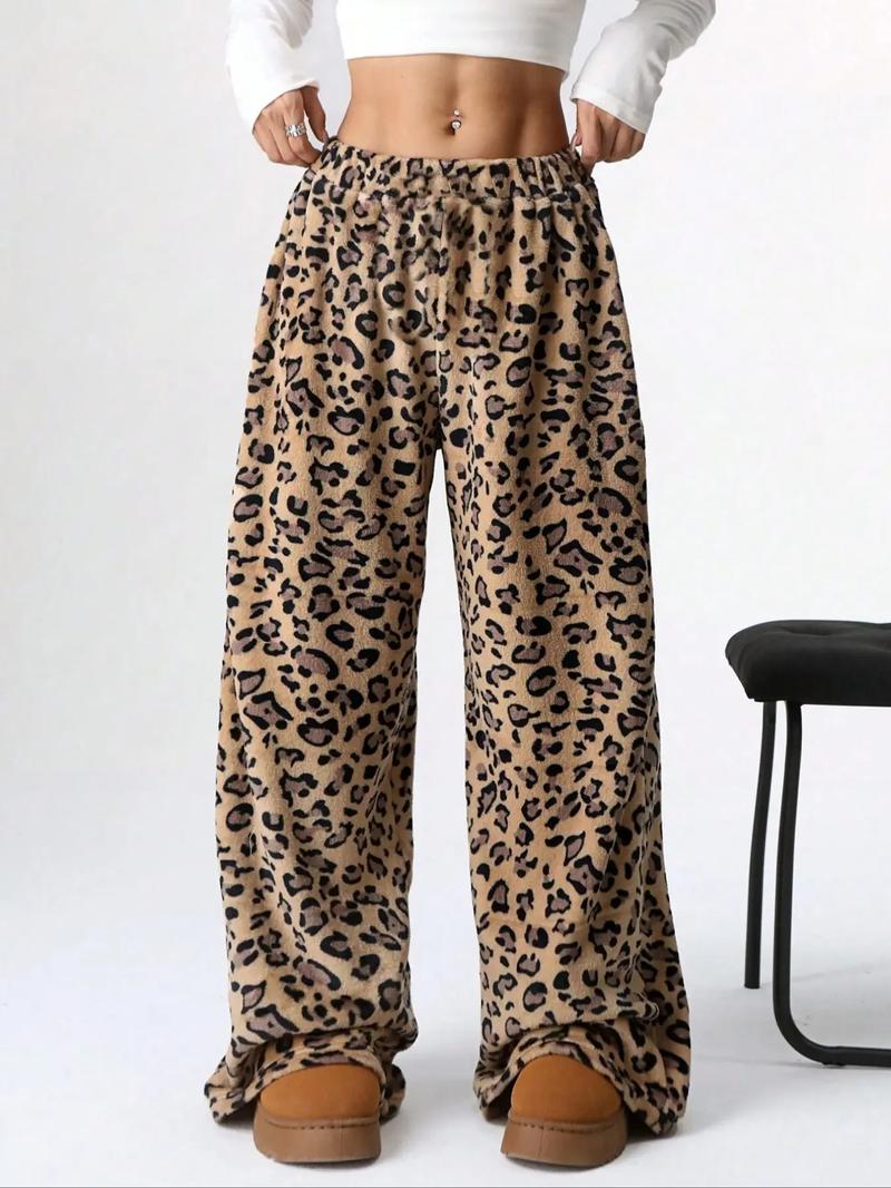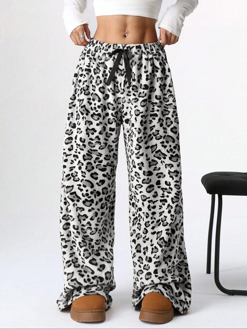 Women'S Leopard Print Bow Decor Elastic Waist Wide Leg Pants, Casual Comfy Trousers for Daily Wear, Ladies Bottoms for Fall & Winter